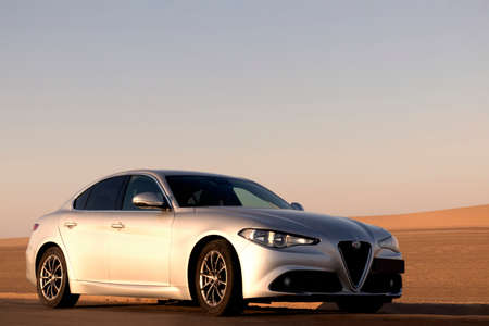 Alfa Romeo Giulia standing in the middle of the desert 14.06.2021. Walvis Bay, Namibia