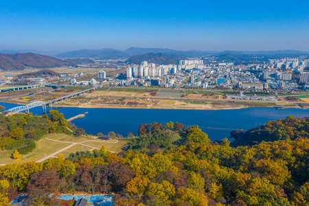 Panoramic view of Miryang city from Moonlight Ssamji park at autumn in Miryang, Korea
