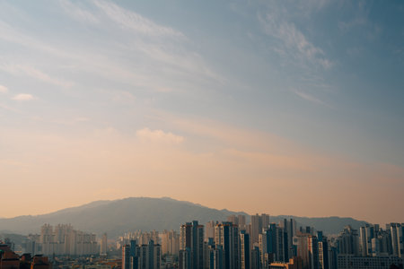 Busan sunset city panorama, beautiful skyline view with high-rise buildings skyscrapers at dawn, Busan port daybreak, cityscape with harbor bay, South Korea, Yeongnam district, sunny day