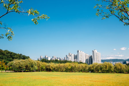 Seoul, Korea - October 6, 2020 : park green forest and Seoul cityscape