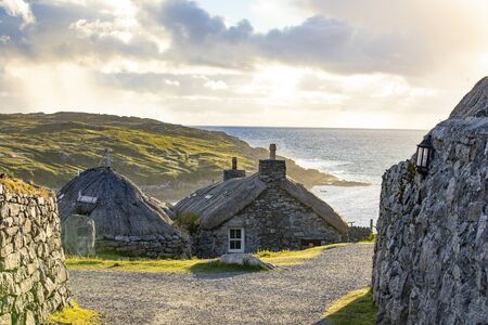 Gearrannan blackhouse village on Isle of Harris in a golden evening light