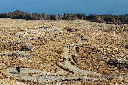 Tourists walking along the Storr trail on the Isle of Sky in Scotland on a warm sunny day