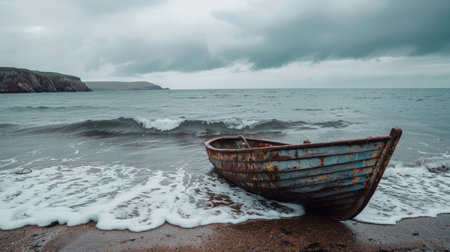 A watercraft is resting on the sandy beach amidst the vast ocean waters. The sky is filled with fluffy clouds and the wind waves gently AIG50