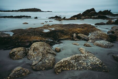 Beautiful shot of a beach at low tide with wet rocks in the foreground taken on a cloudy winter day in Cape Fouldwind, New Zealand