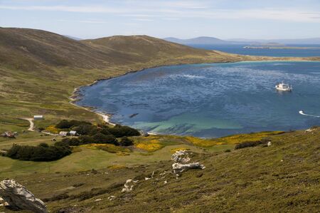 An idyllic bay in the Falkland Islands with a farmhouse by the shore and cruise ship anchored nearby.