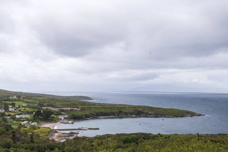 View of the village of Bealtra and Scarriff islands on the Ring of Kerry and Wild Atlantic Way in south west Ireland