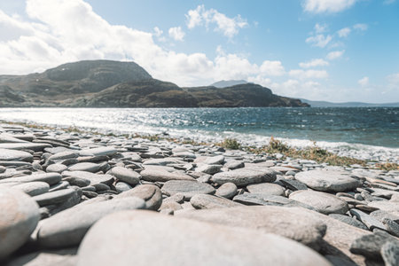 A beautiful view of a beach with stones on a sunny day