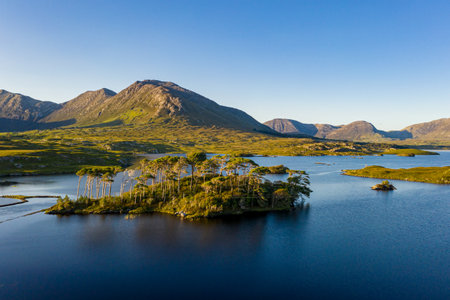 A serene scene features a small wooded island in a calm lake, surrounded by rolling hills , Ireland