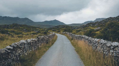 A peaceful rural landscape featuring a winding road flanked by dry stone walls and lush green hills, set under an expansive cloudy sky.