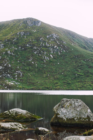 The green irish mountains next to a lake with the white sky
