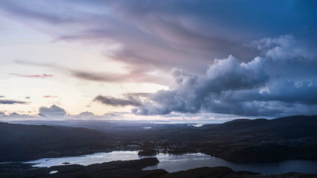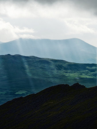 This is a stunning view of the rugged mountain peaks of Ireland. Dark storm clouds loom overhead, while patches of sunlight illuminate the lush green valleys below.