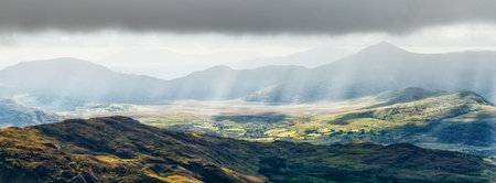 Hill and mountain in Snowdonia National Park with a lake and sunrays crossing the clouds