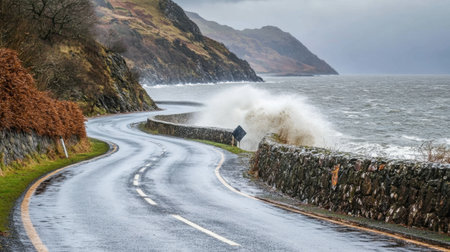 A winding coastal road stretches alongside a stormy sea, with powerful waves crashing against rugged rocks under a moody sky. Nature's raw beauty captivates.