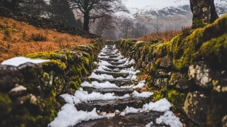 Scenic view of a pathway leading through snow-covered stone steps, surrounded by natural beauty of mountains, offering a tranquil escape into nature's wonders.
