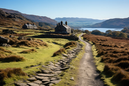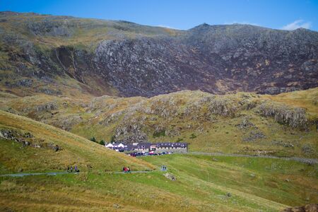 Landscape in Snowdonia National Park in Wales, with a pathway with tourists walking and a building at the background