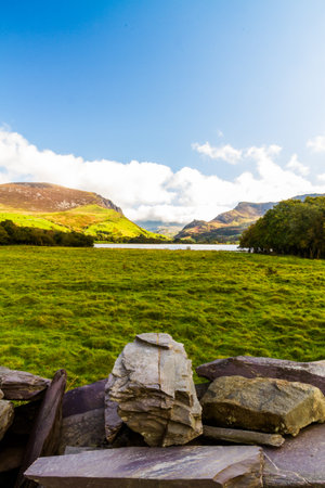 Beautiful lake Nantlle, Snowdonia, Wales. Panorama with foreground of water and meadow. Dramatic, rugged Mount Snowdon in the background. Landscape aspect view with copy space.
