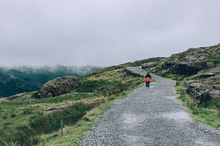 Beautiful landscape panorama of Miners Tack in Snowdonia National Park in North Wales, UK. Shoot during gloomy cloudy day with strong fog