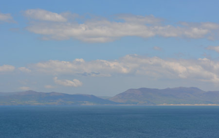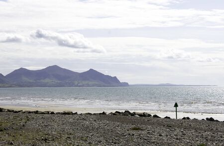 Wales, the Llyn peninsula, a view from Bryn Mor Beach to peaks that are the backbone of the area. Late summer afternoon sun, with waves on the sea on a windy day. Natural beauty, fresh air and health.