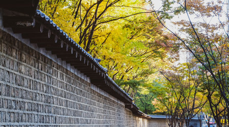 Korean traditional wall with autumn yellow ginkgo tree in Seoul, Korea