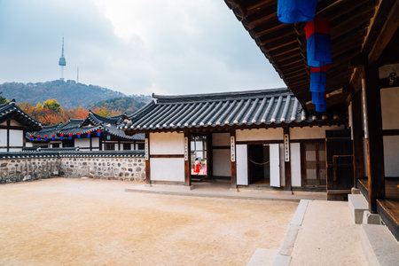 Seoul, Korea - November 04, 2016 : Korean traditional house Hanok and Namsan Seoul tower at autumn