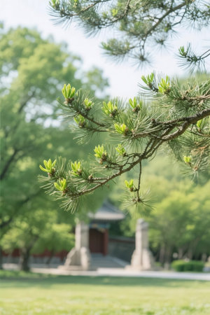a small road in jongmyo shrine surrounded by pine trees. Taken in Seoul, South Korea
