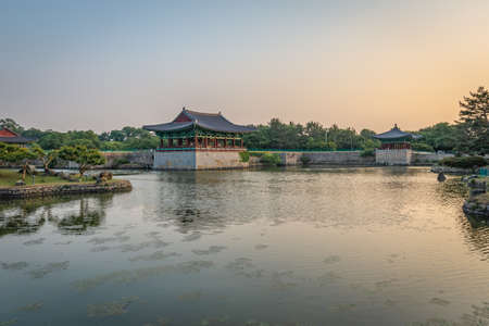 Gyeongju, South Korea - June 5, 2019: Two pavilions of the Donggung Palace and the Wolji Pond, shot at the end of the afternoon