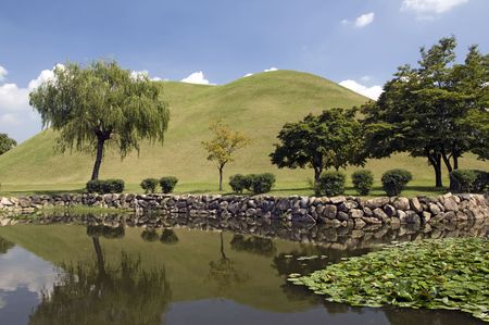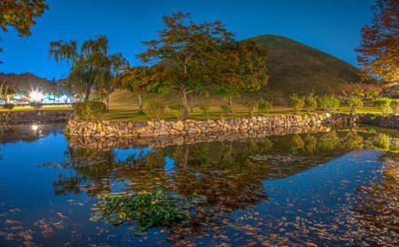 Royal mounds reflections on a small pond in Daereungwon, Gyeongju, South Korea