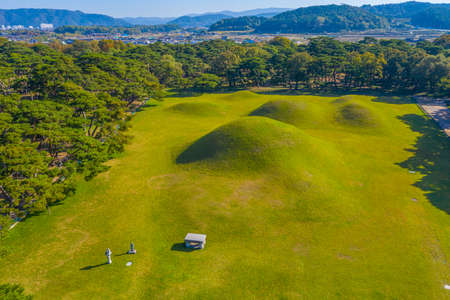 Panoramic view on Royal Tomb of King Gyeongdeok. Tumulus hill complex and Monuments in nice vegetation. Geumseong-myeon, Uiseong County, South Korea, Asia.