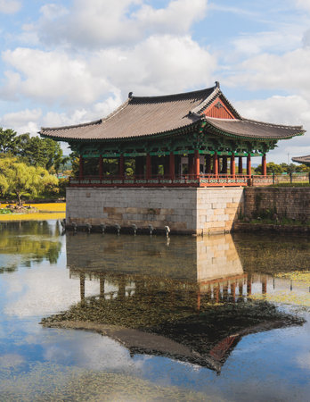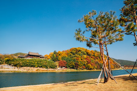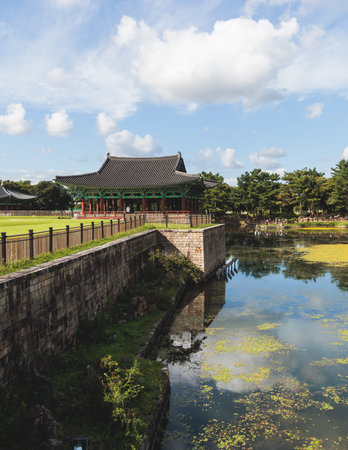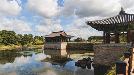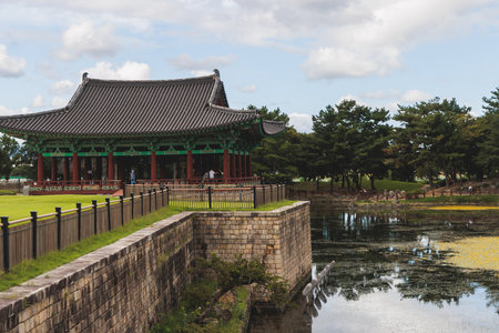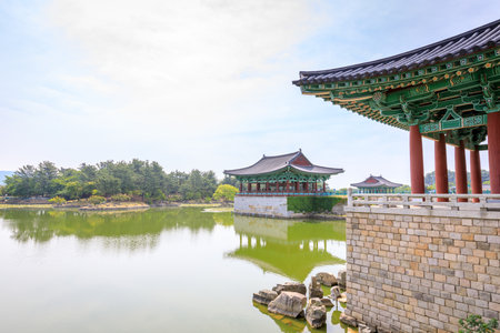 Gyeongju, South Korea, view of Donggung Palace and Wolji Pond in a sunny day, North Gyeongsang Province, Gyeongju city, Silla dinasty traditional Korean hanok architecture, Yeongnam region