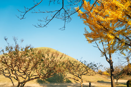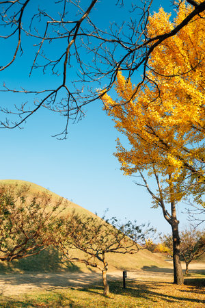 Autumn view of Daereungwon Royal Tomb park with the blue sky in Gyeongju, Soutn Korea