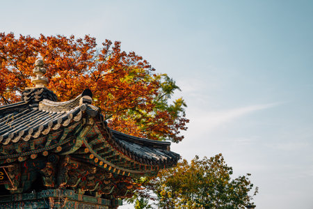 Jingwansa Temple Korean traditional roof with autumn maple in Seoul, Korea
