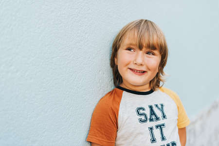Outdoor portrait of adorable kid boy wearing t-shirt with the sign Say It