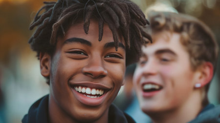 Two smiling teenage boys with different hairstyles in a park during autumn. Gay couple joy and friendship