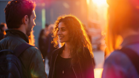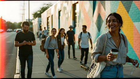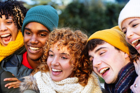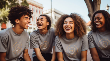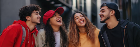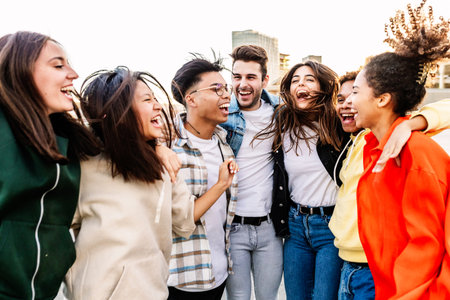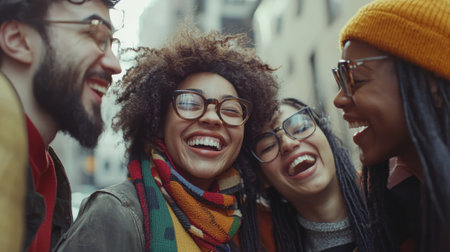 group of friends of different cultures laugh joyfully in an urban environment sharing stories and celebrating their unique backgrounds under clear skies.
