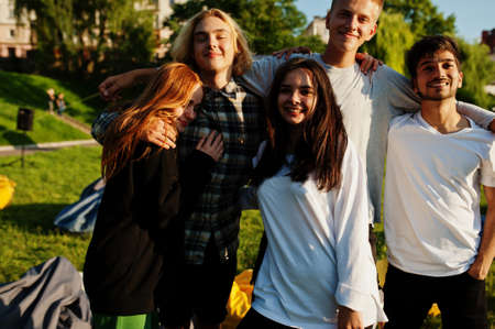 Group of cheerful multiethnic teenagers looking at camera while standing outdoors