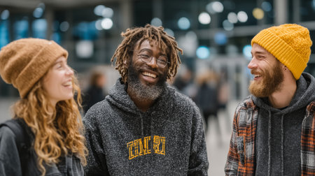 Three cheerful young adults bonding and laughing together in a bustling indoor setting
