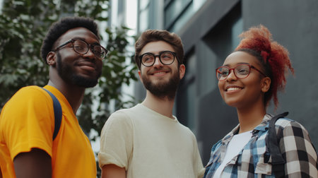 Three happy young adults smiling joyfully outside, symbolizing friendship and diversity