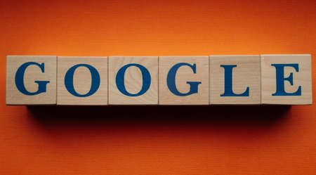 January 31, 2022. Mountain View, California. The name of the Google company, laid out from wooden cubes.