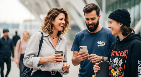 Three friends, two men and one woman, walk together in a modern cityscape, engaged with a smartphone, with blurred background people and sleek architecture.