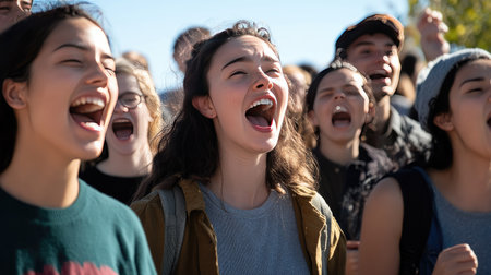 Detailed shot of a group of people singing in harmony at a community event, capturing the enthusiasm and connection between the performers.