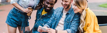 young and cheerful multicultural travelers looking at camera outdoors, banner