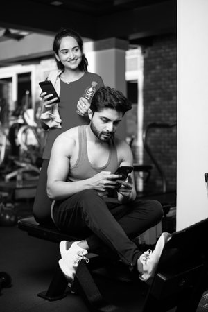 Sporty Indian asian man and woman resting between exercises and using smartphone at gym, presenting something or taking selfie picture