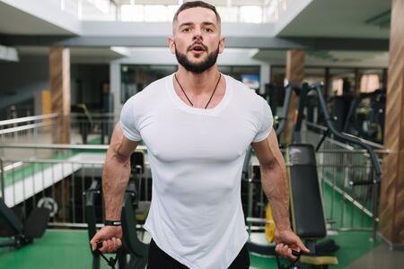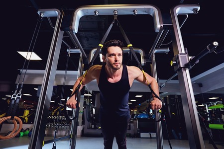 Man use elastic rof training in the gym. Man in white t-shirt trains inside