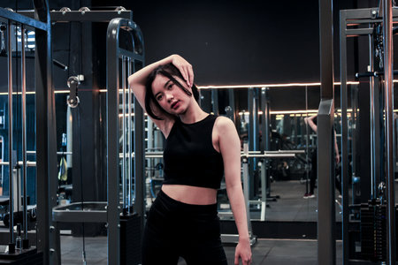 Energetic Fitness Sportswoman at Gym. Asian Woman Athlete Sitting and Looking at Camera. Beautiful Girl Cuties and Confidence in Fitness Center