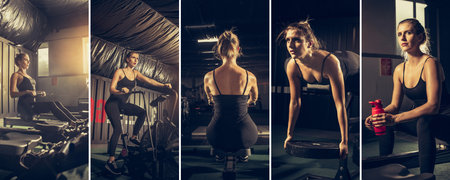 Collage about fit women, coach training at the fitness gym. Sport, training, athlete, workout, exercises concept