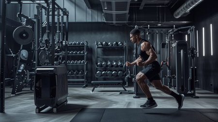 Modern gym equipment in an industrial setting with well-lit training area and focus on resistance machine details. Generative AI