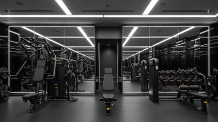 This image showcases a modern gym interior with exercise machines. The scene is dominated by monochromatic tones, highlighting the equipment's silhouettes against a dark backdrop. Overhead lighting and large mirrors create symmetry and depth. Suitable for commercial or editorial applications related to fitness and wellness.