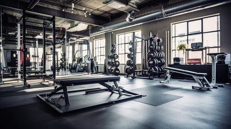 Modern gym interior with sport and fitness equipment, fitness center interior, interior of crossfit and workout gym, loft. Generative AI Technology