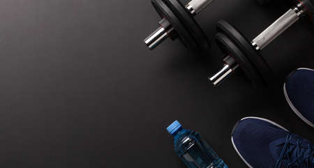 Sneakers and dumbbells. Sport, fitness and healthy lifestyle background. Top view flat lay with copy space