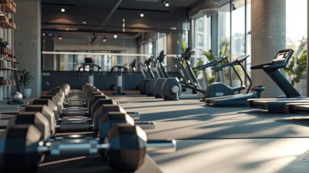Spacious modern gym with treadmills and ellipticals in bright room. That the image is generated using AI.